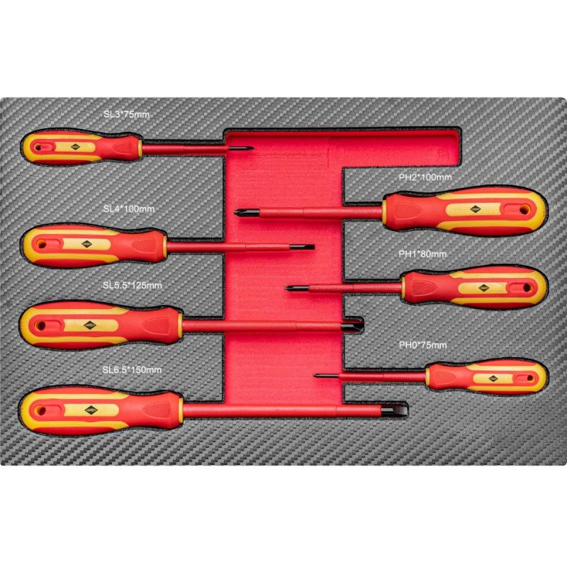 - 7x VDE skrūvgriežu komplekts PH0*75,PH1*80,PH2*100,SL3*75mm,SL4*100mm,SL5.5*125mm,SL6.5*150mm