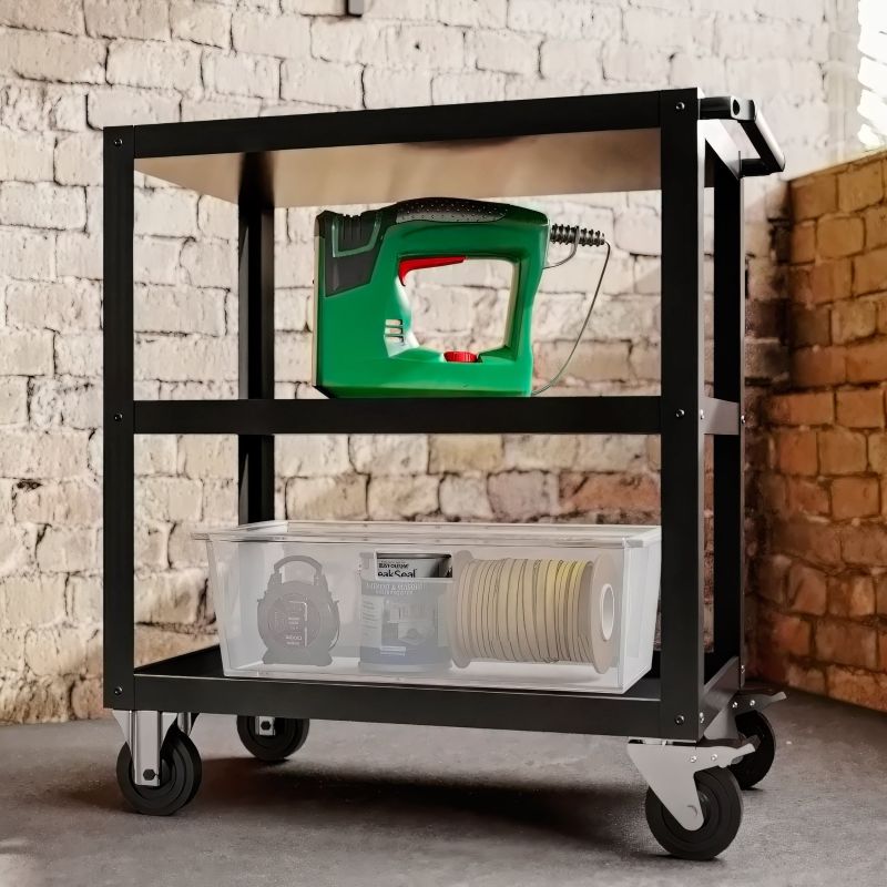 Maksimāli vienkārša konstrukcija ar trim plauktiem garantē ērtu piekļuvi instrumentiem. Katram līmenim ir paaugstināta malā, kas pasargā priekšmetus no krišanas. Pārvietojot darbnīcas ratiņus HUGO, jūs varat būt droši, ka neviena skrūve vai skrūvgriezis neizkritīs uz grīdas.