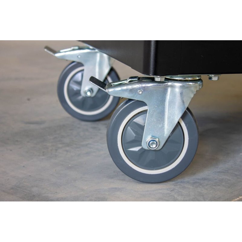 Lieli 4,9 collu grozāmie riteņi ar gumijas protektoru ļauj viegli pārvietot ratiņus pa dažādām virsmām. Divi riteņi ir aprīkoti ar bremzēm, kas garantē drošu un stabilu novietojumu darba laikā.