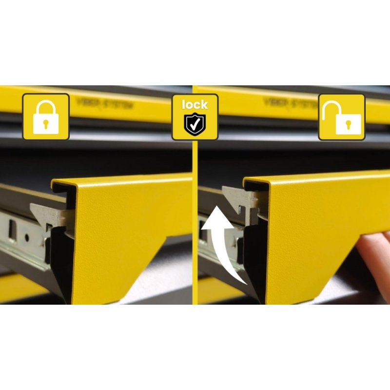 Katrai atvilktnei ir sprūdrata fiksators, kas pasargā no nejaušas atvēršanās ratiņu pārvietošanas laikā. Viss atvilktņu modulis tiek slēgts ar atslēgu — jūsu instrumenti vienmēr ir atbilstoši aizsargāti.