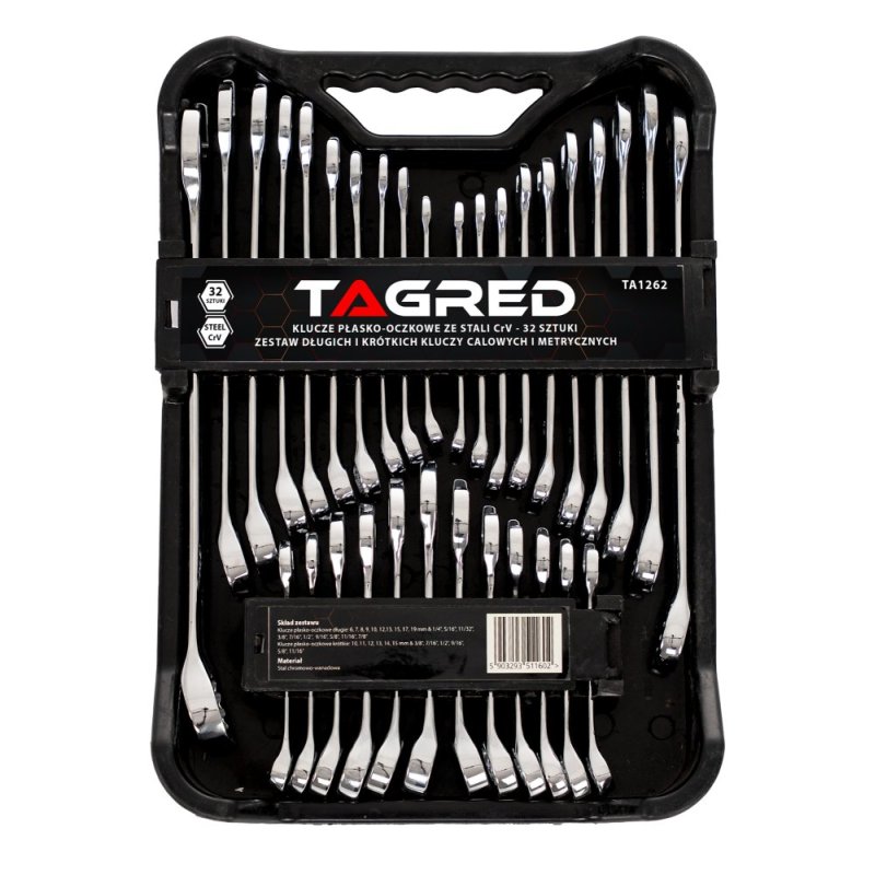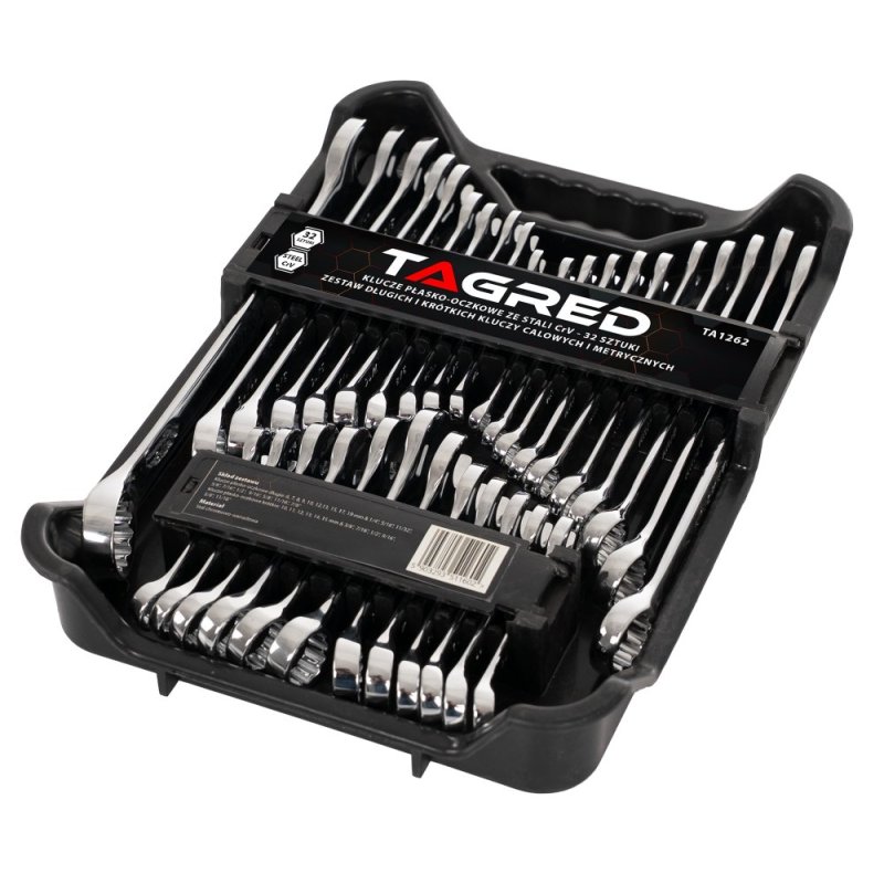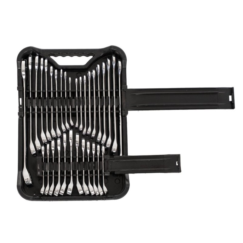 32 gab. plakani-gredzenveida atslēgu komplekts ir praktisks risinājums ikvienam, kam nepieciešams pamata instrumentu komplekts sīkiem darbiem mājās vai garāžā. Komplektā ietilpst populāru metrisko (no 6 mm līdz 19 mm) un collu izmēru atslēgas, kas padara to universālu ikdienas lietošanai.