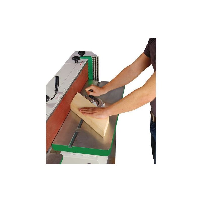 Standarta komplektācijā ar -45° līdz +45° leņķī bezgala regulējamu slīpuma un apstrādājamās detaļas žogu.