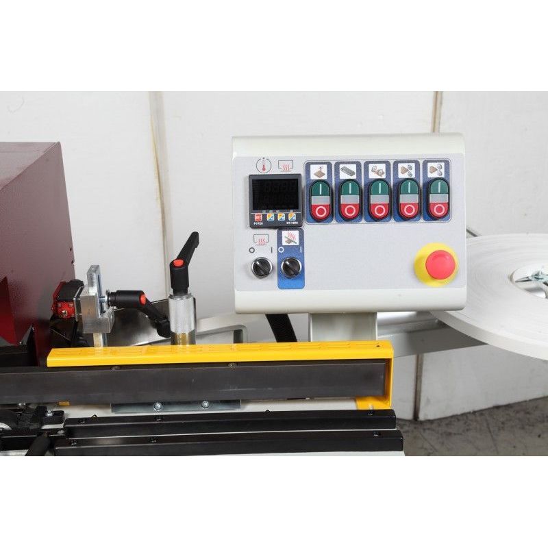 - Iekārtu vada elektronisks panelis ar apgaismotām pogām. Šīs pogas ir izvietotas 2 rindās. Pogas augšējā rindā ļauj pārslēgt atsevišķas apstrādes vienības no miera stāvokļa uz darba stāvokli (pneimatiskā cilindra vadība). Savukārt pogas apakšējā rindā aktivizē šo agregātu apstrādes instrumentus (motora vadība). Līmes uzklāšanas vadības ierīcei ir enerģijas taupīšanas režīms. Pietiek pusstundu nelietot padevi, un līmes temperatūra tiek samazināta līdz 170 grādiem C, lai atkal atjaunotu darba temperatūru, kad tiek ieslēgts kāds no mašīnas motoriem.
