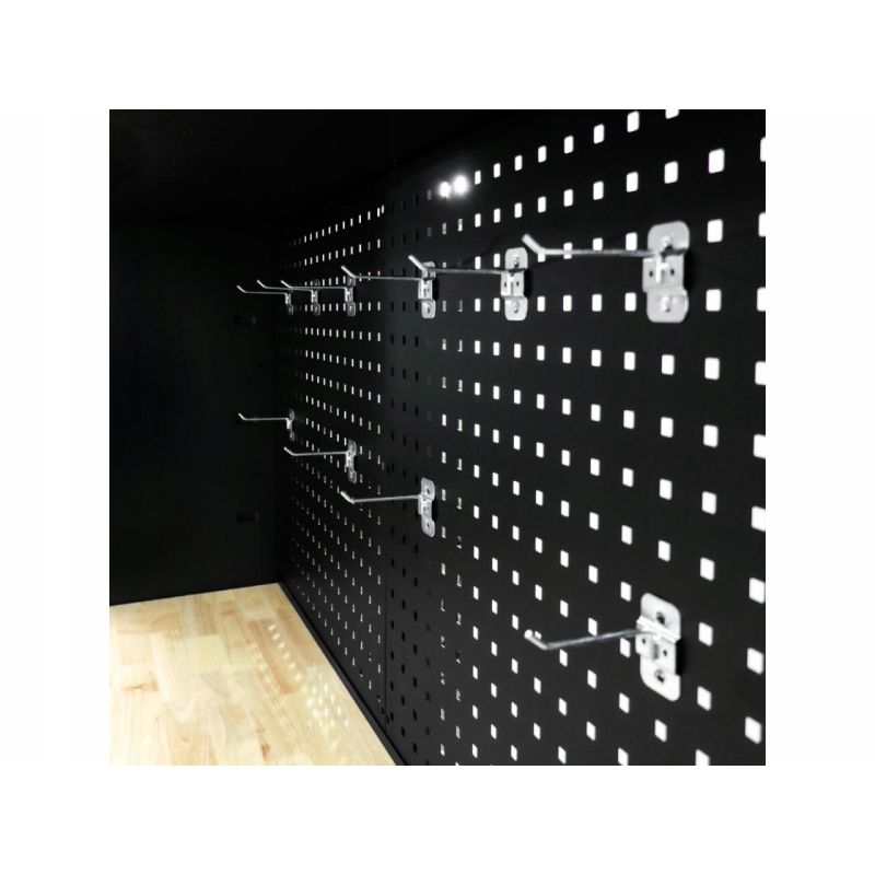 Aizmugurējā siena sastāv no četriem sienas paneļiem . Uz plāksnēm var iekarināt komplektā iekļautos 10 āķus, kas lieliski piemēroti pneimatisko instrumentu un uzgriežņu atslēgu piekāršanai. Ērts risinājums, kad vēlaties, lai viss būtu pa rokai. Komplektā divi diski.