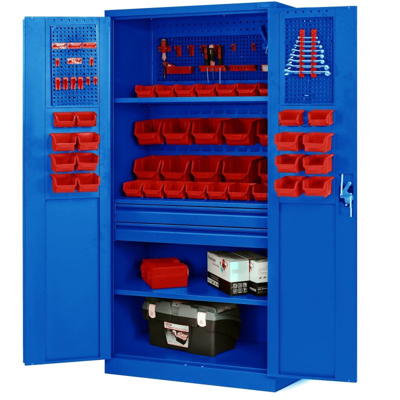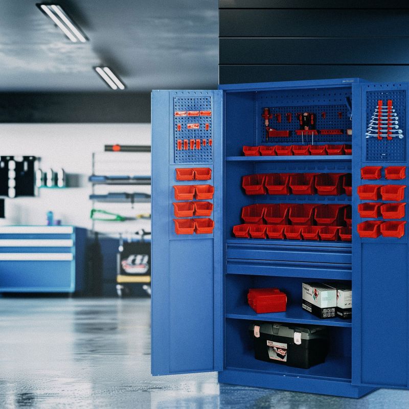 Zils JAN NOWAK skapis, modelis SZYMON – metāla darbnīcas skapis, instrumentiem, augam, darbnīcai