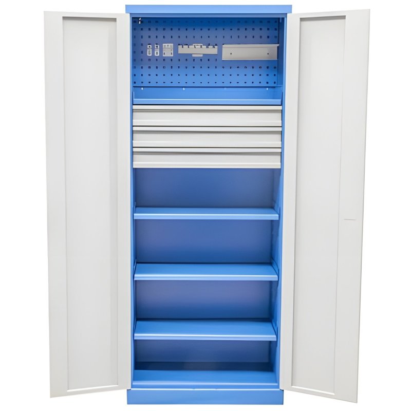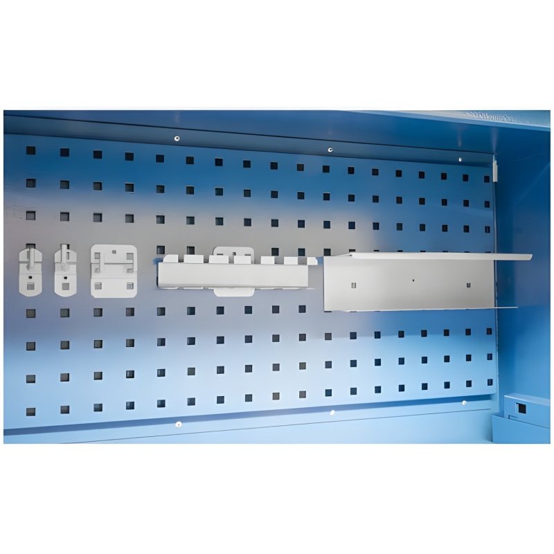 Pilnībā salikts, slēdzams instrumentu skapis optimālai instrumentu un mazu detaļu glabāšanai. Četri universāli piestiprināmi plaukti ļauj uzglabāt lielākus instrumentus vai mašīnas. 3 lodīšu gultņu atvilktnes nodrošina mazu detaļu vai, piemēram, mērinstrumentu organizēšanu. Komplektā ietilpst integrēts perforēts dēlis un āķu komplekts skrūvgriežu, āmuru, knaibļu un divu aerosola baloniņu turētāju pārskatāmai glabāšanai. Izturīga, pulverkrāsota tērauda konstrukcija ar iekšējām eņģēm un slēptiem bloķēšanas stieņiem. Augstas kvalitātes cilindra slēdzene ar divām atslēgām nodrošina drošu instrumentu glabāšanu.