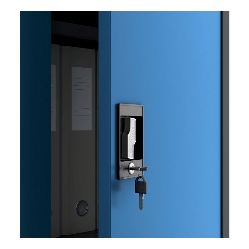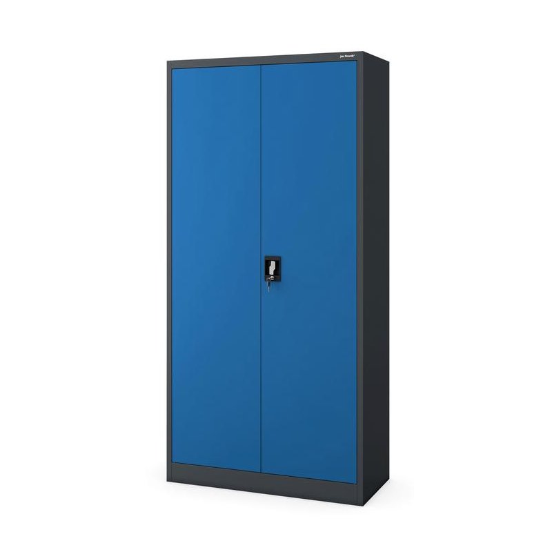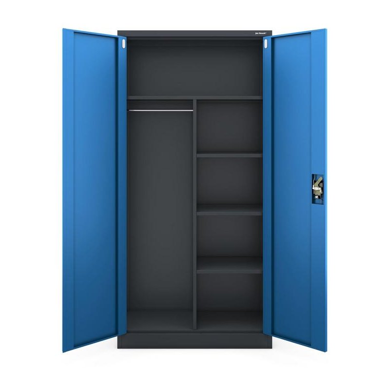 Metāla saimniecības skapis DAWID ir ideāli piemērots vietām, kur laba organizācija ir zelta vērta. Divdurvju skapja kompaktais izmērs un tajā pašā laikā lielā ietilpība padara to par neaizstājamu mēbeli birojā, darbnīcā, sporta zālē, medicīnas kabinetā vai pat mājās. Skapja iekšpusē var ievietot drēbes, instrumentus, dokumentu mapes, kastes un citus piederumus. Aizslēdzamais skapis interesantā antracīta un zilās krāsas kombinācijā efektīvi organizē telpu un palīdz uzturēt kārtību.