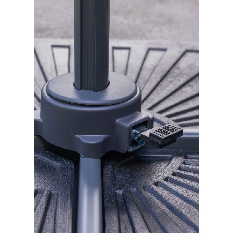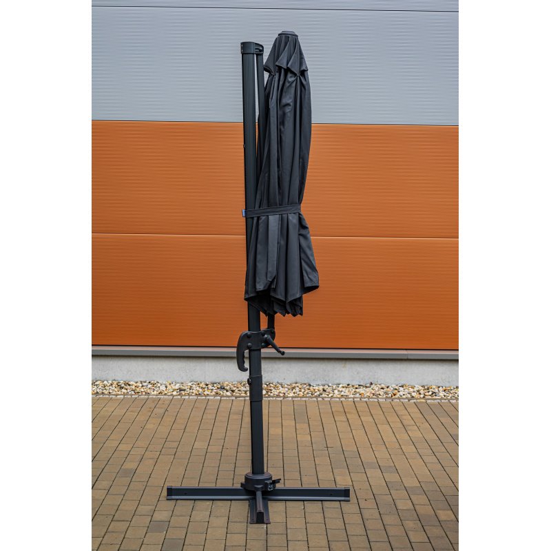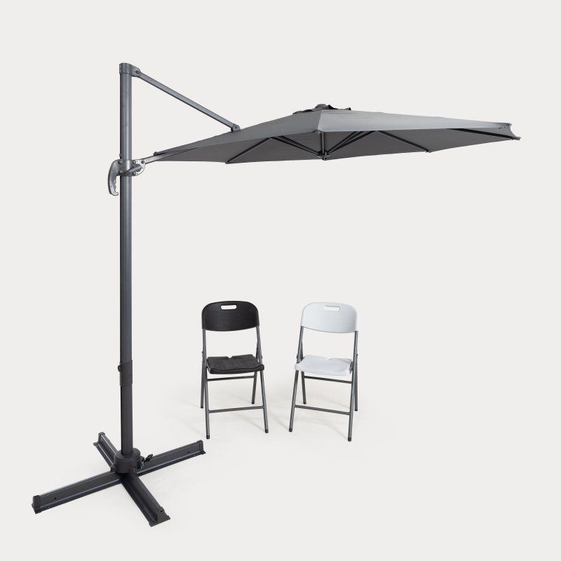 Šis augstas kvalitātes 3 metri garais nokaramais saulessargs nodrošina drošu aizsardzību pret sauli jebkurā laikā neatkarīgi no saules stāvokļa. Saulessargs, kura izmēri ir 300 x 244 cm, pārklāj lielu laukumu un droši aizsargā pret saules stariem. Pateicoties integrētajai slīpuma un salocīšanas sistēmai, saulessarga audumu var noliekt gan vertikāli, gan horizontāli, padarot to ideāli piemērotu zemai saulei. Saulessargam ir kloķis ērtai lietošanai un 360° rotācijas funkcija, ko aktivizē ar kājas slēdzi. Tas novērš problēmas ar saulessarga pārvietošanu, jo to var ērti pagriezt ap savu asi. Izturība un kvalitāte atbilst visaugstākajiem standartiem. Lietussarga rāmis ir izgatavots no alumīnija ar pulvera pārklājumu, savukārt astoņas ribas ir izgatavotas no izturīga tērauda, kas nodrošina izturību. Lietussarga nojume, kas izgatavota no 200 g/m² poliestera, nodrošina UV aizsardzību 50+ un ir pilnībā izturīga pret laikapstākļiem. Neskatoties uz tā izmēru un stabilitāti, sverot 25 kg, lietussargu nevar pagriezt, bet to var noliekt. Tas tiek piegādāts komplektā ar pamatni (bez paneļiem), un vēl lielākai stabilitātei var izmantot īpašos ONDIS24 lietussargu atsvarus, kurus var piepildīt ar smiltīm vai ūdeni. Lūdzu, ņemiet vērā, ka visi izmēri, ieskaitot piegādes svaru, ir aptuveni. Ja jums nepieciešama precīzāka informācija, mūsu atbalsta komanda ar prieku jums palīdzēs. Tāpat vēlamies norādīt, ka preču attēlos redzamie krēsli ir paredzēti tikai ilustratīviem nolūkiem un nav iekļauti cenā.