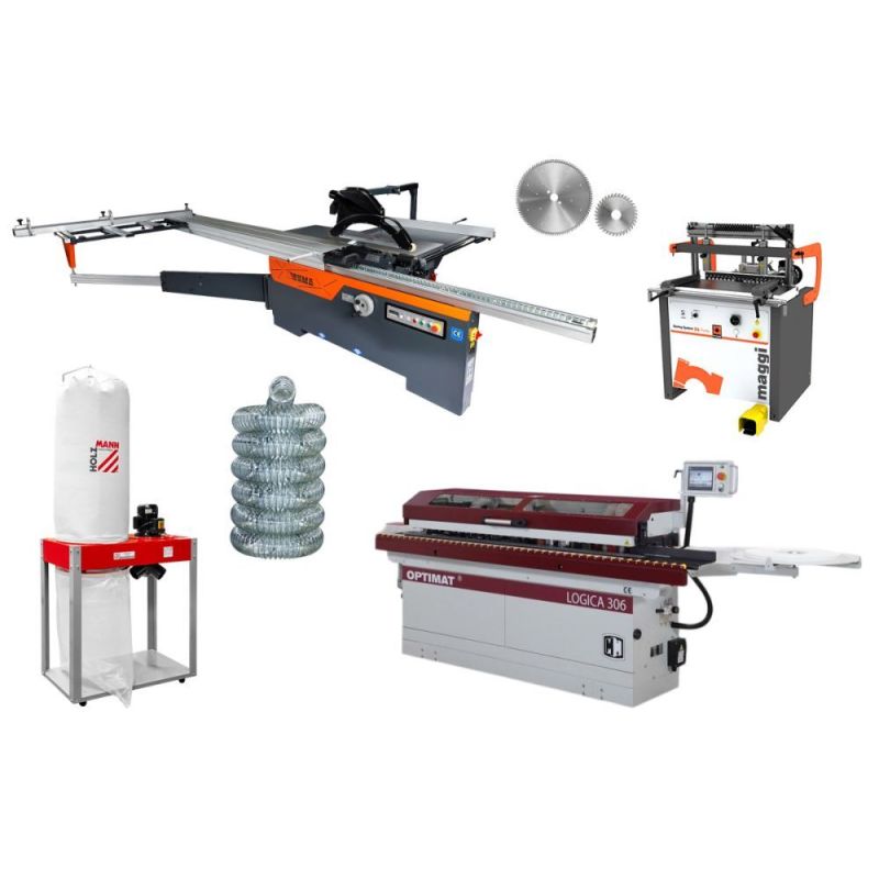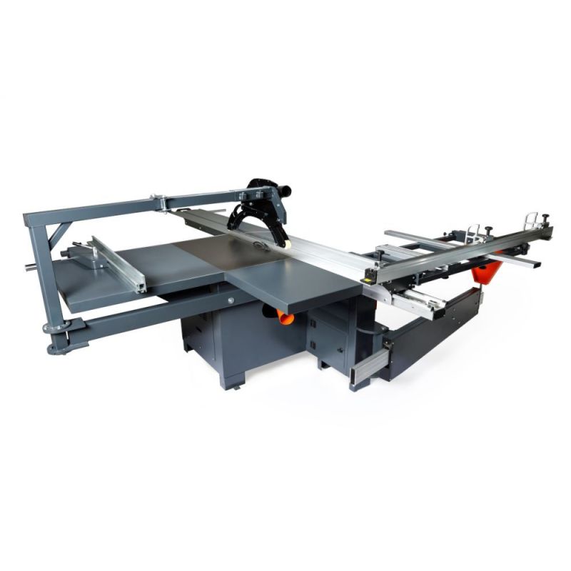 - Rema Fx250 formāta zāģis ar 3000 mm bīdāmo galdu un 45/90° nosūces pārsegu.