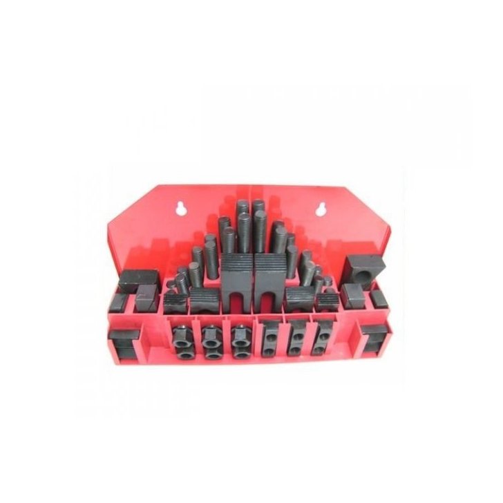 Stiprinājuma spīļu komplekts tiek izmantots frēzmašīnās, urbjmašīnās un citās atslēdznieku mašīnās, kurām ir galdi ar T-veida gropēm.