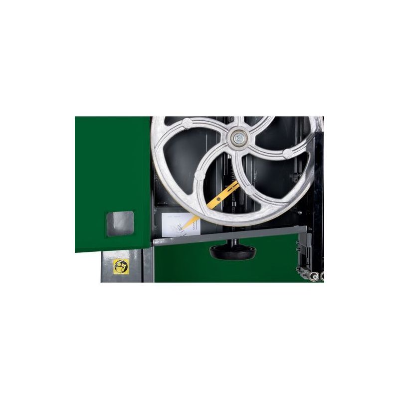 Ātra zāģa diska spriegojuma noteikšana, izmantojot ekscentrisko sviru mašīnas aizmugurē, nemainot pamata spriegojuma iestatījumu