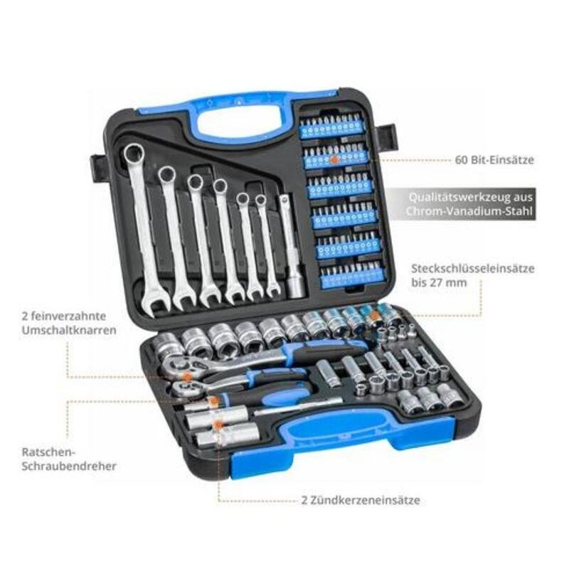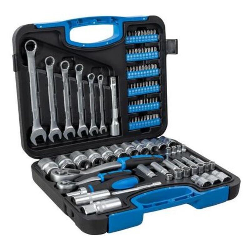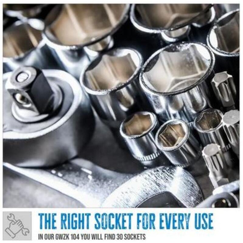 Šis instrumentu komplekts ir praktiski iepakots 104 detaļu koferī. Tas ietver 2 sprūdrata uzgaļus (1/2" un 1/4" ar 72 zobiem) ar atbilstošām īsām un garām uzgaļiem, kā arī atbilstošiem pagarinātājiem. Liels uzgaļu, uzgaļu skrūvgriežu ar sprūdrata funkciju, kā arī visu nepieciešamo adapteru un 6 atvērto uzgriežņu atslēgu sortiments padara šo komplektu pilnīgu.