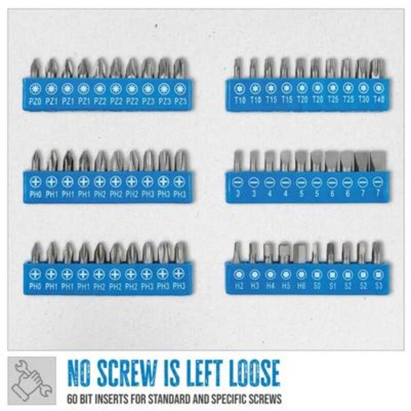 • 60 uzgaļu ieliktņi 1/4" (6,3 mm): Krustveida iedobums: PH0, PH1, PH2, PH3; PZ0, PZ1, PZ2, PZ3