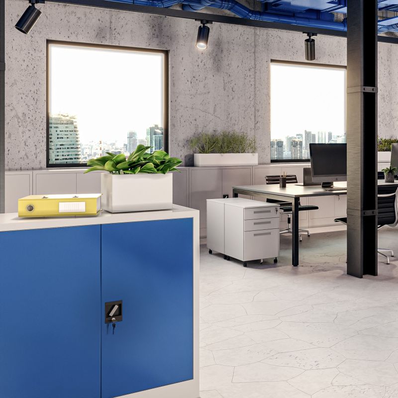 Metāla skapīši bieži tiek saistīti ar pelēku apdari un neapstrādātu raksturu. Tas nav noteikums. Jan Nowak risinājumi ir pieejami dažādās krāsās, tāpēc varat izvēlēties modeli, kas lieliski atbilst jūsu interjeram. Šim BEATA slēdzamā skapja variantam ir klasisks pelēks korpuss, savukārt tā durvis ir pārklātas ar zilu krāsu.