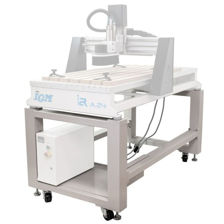 IGM statīvs CNC frēzei A24 nodrošina izturību un stabilitāti, kas ir būtiska CNC apstrādē. Riteņi ļauj brīvi pārvietot iekārtu pa darbnīcu, savukārt regulējamas kājas ļauj to nolīmeņot un nostiprināt vietā.
