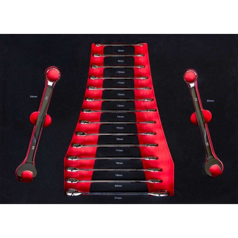 16 gab. plakanās atslēgas: 8, 9, 10, 11, 12, 13, 14, 15, 16, 18, 19, 20, 21, 22, 24 mm